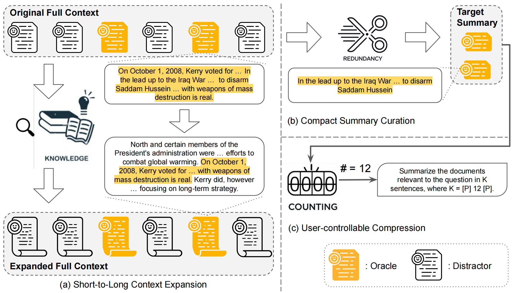 - The overview of the synthetic data pipeline for training BRIEF-PRO is as follows. Starting with a mixture of oracle and distractor documents for a given query, the pipeline: (a) expands each document by looking up an external knowledge corpus, (b) curates a compact summary by further reducing redundancy in the oracle documents, and (c) generates a user-controllable compression instruction by counting the number of sentences in the compact summary.