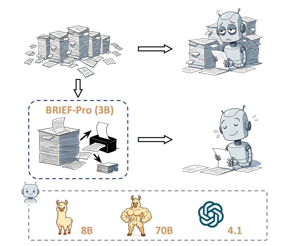 - BRIEF-PRO. It is a universal, lightweight compressor that distills relevant evidence for a given query from multiple retrieved documents into a concise summary for seamless integration into in-context RAG.